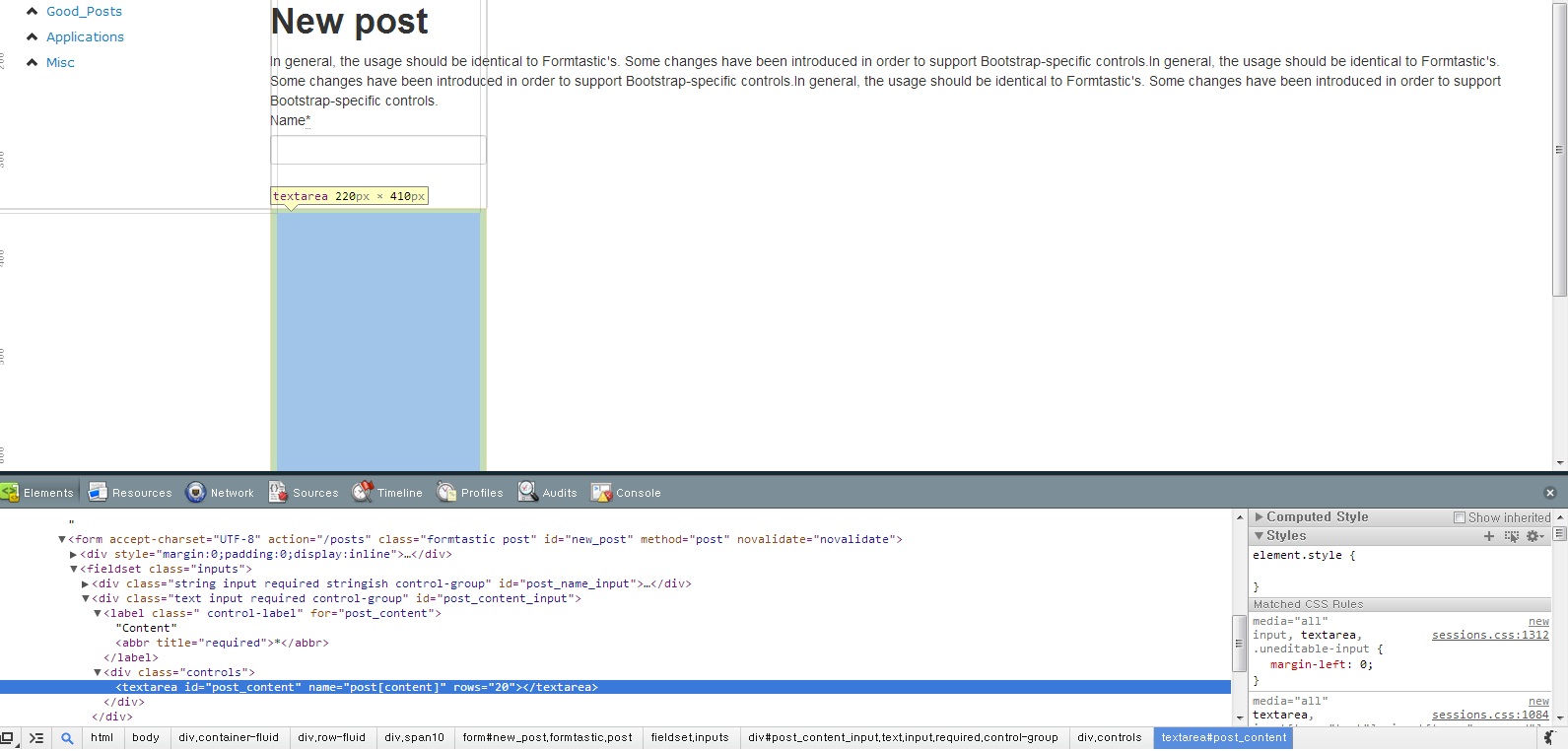 <div class="text input required control-group" id="post_content_input"><label class=" control-label" for="post_content">Content<abbr title="required">*</abbr></label><div class="controls"><textarea id="post_content" name="post[content]" rows="10" width="100000"></textarea><span class="help-block">enter the content</span></div></div></fieldset>摘要:为什么会发生这种情况,在哪里可以找到formtastc.css文件?它不在“资产”文件夹中,但页面正在以某种方式加载css。