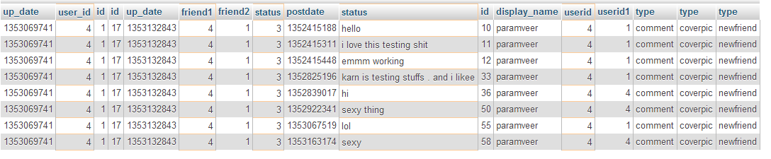 我试图从四个表中获得有关“类型”的数据。类型可以是注释,封面图片更改,朋友请求接受等,但问题是,我所做的查询不是重复类型的所有和时间戳的所有。我所做的查询是