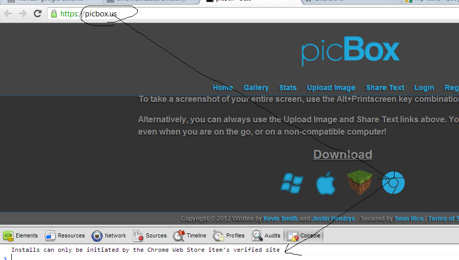 如果您验证某个域(例如,http://example.com)的所有权,您可以只从任何子域或页面(例如,http://app.example.com或http://example.com/page.html)执行启动内联安装。检查这个验证。通过对picbox.us进行域验证,您需要使默认页面显示为picbox.us\index.html,并将所有内容张贴在那里,以使chrome内联安装运行。