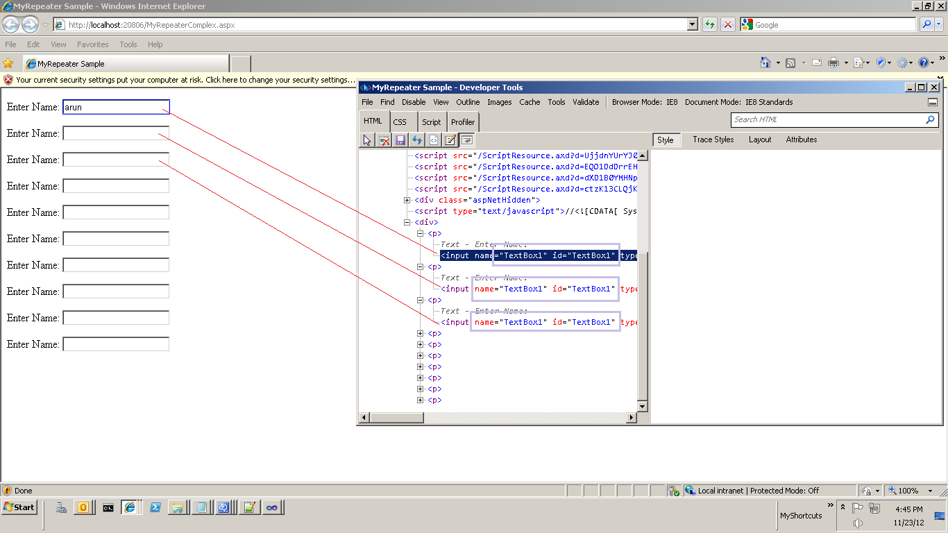 <p>Enter Name: <asp:TextBox ID="TextBox1" runat="server"></asp:TextBox></p>