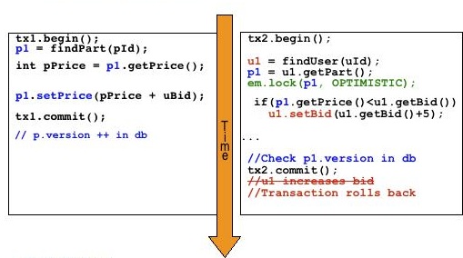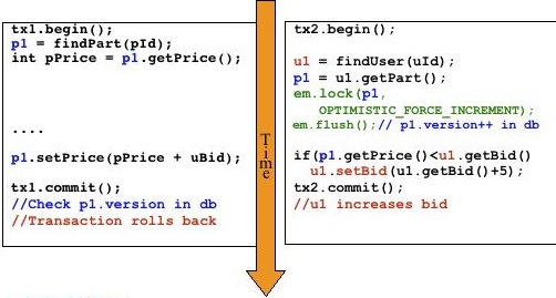 当用户选择这种模式时,他必须将EntityManager的状态刷新到数据库中,以手动增加version字段。因此,所有其他乐观事务都将失效(回滚)。在事务结束时还会对版本进行检查,以提交或回滚事务。