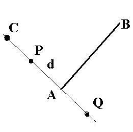 我想要找到一个点(比如说P)的坐标,它远离一个已知的距离(比如说d)。情况是:我想要的点在一条直线(3d)上,它垂直于另一个给定的线段(3d),并通过给定线段的一端(例如A)。因此,我知道给定线段的两个端点(也是直线上的向量),以及垂直线的距离d和向量。此外,C点的垂直线通过也是已知的。我正在上