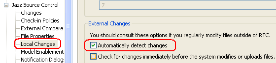 如果您在Windows上使用RTC 4.0 Eclipse客户端,它可能有助于启用"Preferences > Team > Jazz源代码管理>本地更改>自动检测更改“。
