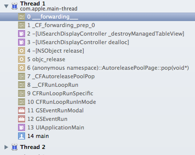 在这一点上,这是一个很好的工作,显然,有些东西已经改变了。当我离开加载searchDisplayController的searchDisplayController时,我的应用程序将向已释放的实例发送一条消息。堆栈是我相信它是searchDisplayController的原因: