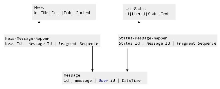 在用户创建一个句子之后,您可以获取相关的内容新闻和状态ans,直接将形成的消息存储在一个表中,因此您将有一个为read优化的消息表: