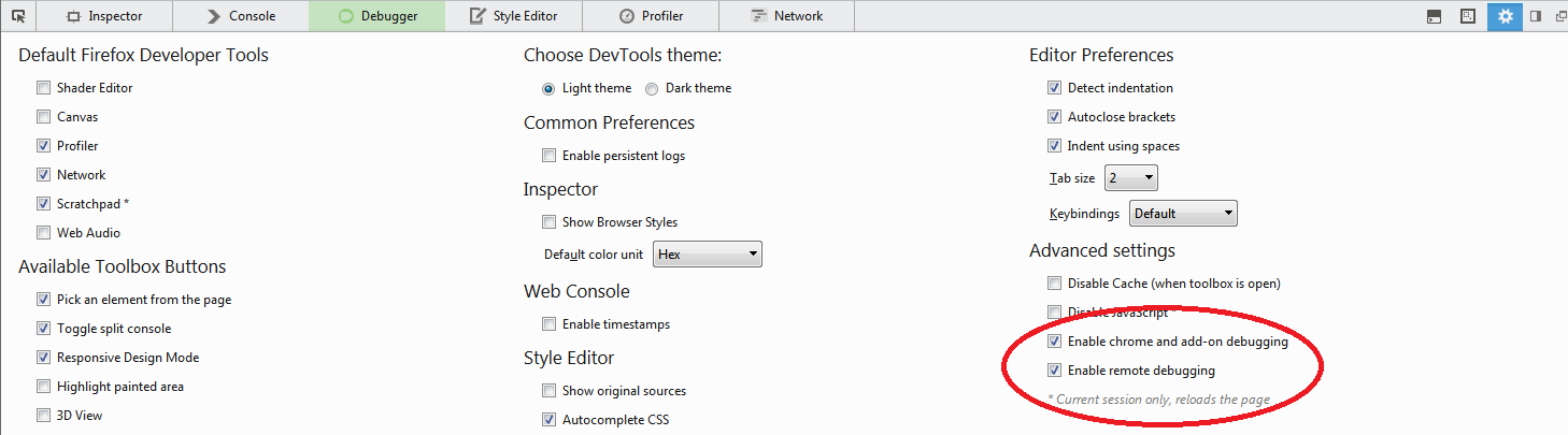 更新: Firefox v32和更高版本已经内置了对无起点 和 基于SDK的 插件的调试支持。作为在Mozilla的文件中,上面提到的“远程调试”现在在Web窗格的设置中有一个复选框: