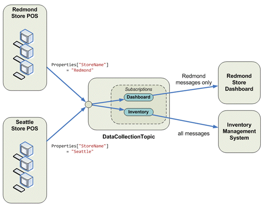 Topic。Subscription ( Filter设置为Redmond)。Subscription (没有Filter,意味着它将接收所有消息)。其实很简单。您的客户端向主题发送一条消息(类似于队列),并可以向该消息添加一些元数据(这可以用作binding key)。现在不从主题本身读取消息,主题将将消息转发给所有订阅。要实现消息路由,只需使用类似于SQL的语法对一个或多个订阅设置一个筛选器。