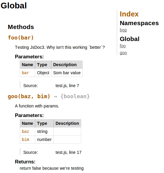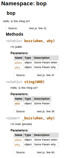 有时它取决于您正在使用的jsdoc3模板。我使用几个模板生成了一个输出,这样我们就可以根据需要比较哪一个最合适:https://cancerberosgx.github.io/jsdoc-templates-demo/demo/,我会花费更多的时间,但我认为这对做出决定非常有帮助。此外,它还记录了它们中的每一个是如何生成的。希望能帮上忙!