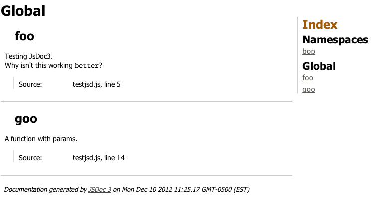 };我在运行./jsdoc -r -l test.js。问题是我得到的输出相当平淡,而且缺乏很多信息: