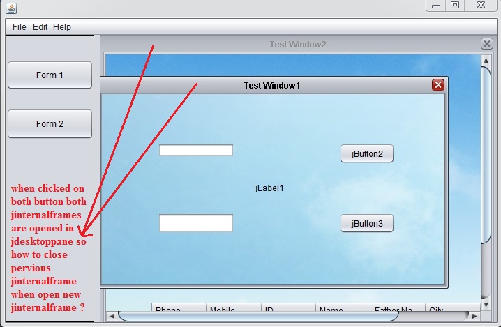 我使用MDI在java中创建了netbeans (多文档接口),其中我有两个button按钮和一个jbuttons窗格,所以当在两个按钮上单击时,两个j内在框架都在同一个jbuttons窗格中打开,所以我想要如何在jdesktoppane中的open new jinternalframe中打开close previous jinternalframe?