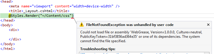Install-Package Microsoft.AspNet.Web.Optimization -Version 1.1.0这导致安装了1.3.0版本的WebGrease,在加载使用_Layout.cshtml页面的MVC剃须刀视图时没有造成任何问题。
