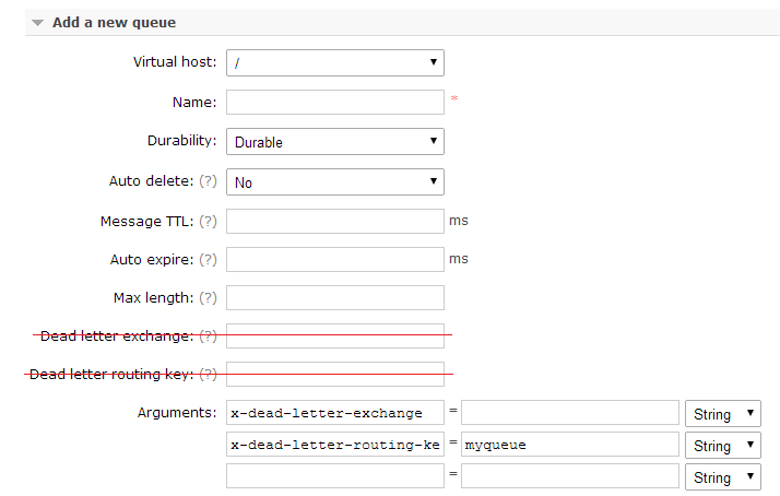 使用RabbitMQ管理(v3),我尝试创建一个队列,该队列将向默认交换发送死信消息,并在该队列上绑定一个路由键"MyErrorRoutingKey“。所以在管理界面上,我留下了“死信交换”的空白。