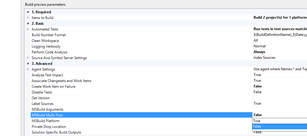 对于不再存在MSBuild多Proc参数的TFS 2013,尝试将MSBuild参数设置为/m:1。