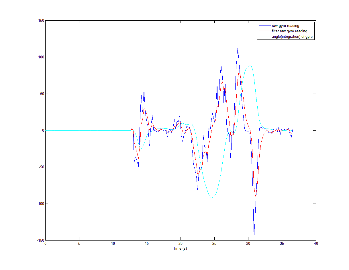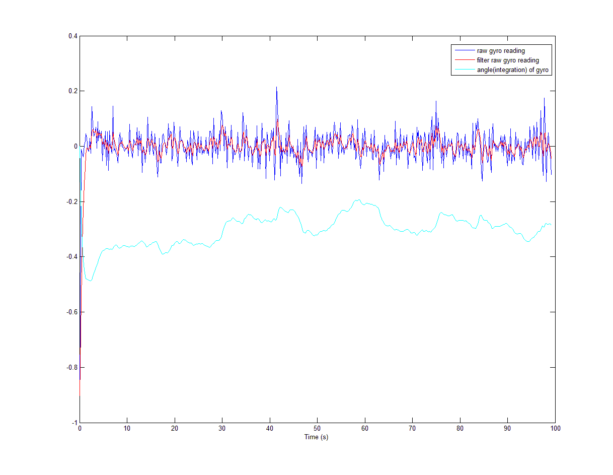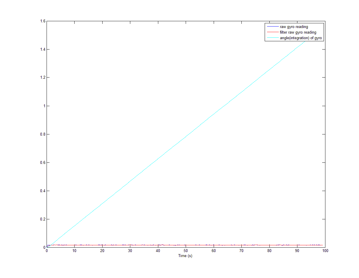 所以,我做了一个实验。接下来的两个数字是我得到的。下图显示陀螺仪读数一点也不漂移,但有偏移量。由于偏移,集成是可怕的。所以,似乎整合就是漂移,是吗?