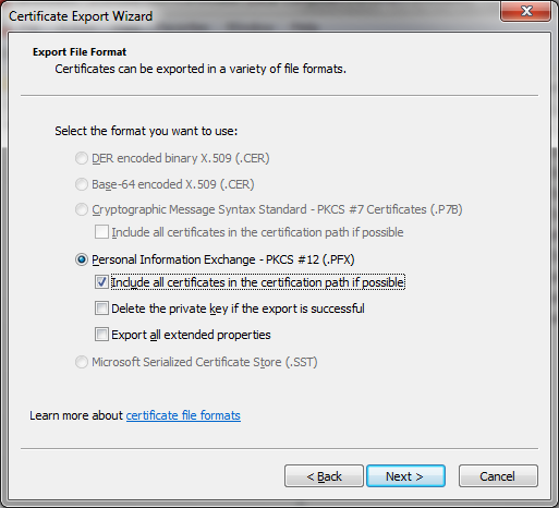 尝试导出中间pem文件的编辑将导致.cer文件。有办法把这个转换成pfx吗?
