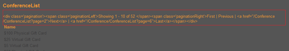因为Html.Pager只返回包含html的普通string,所以需要使用Html.Raw来防止Razor中的自动编码: