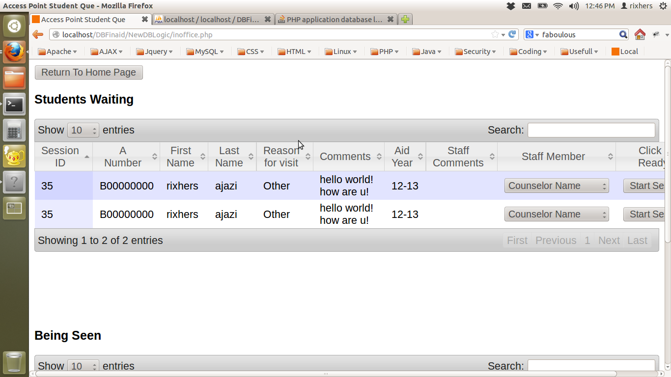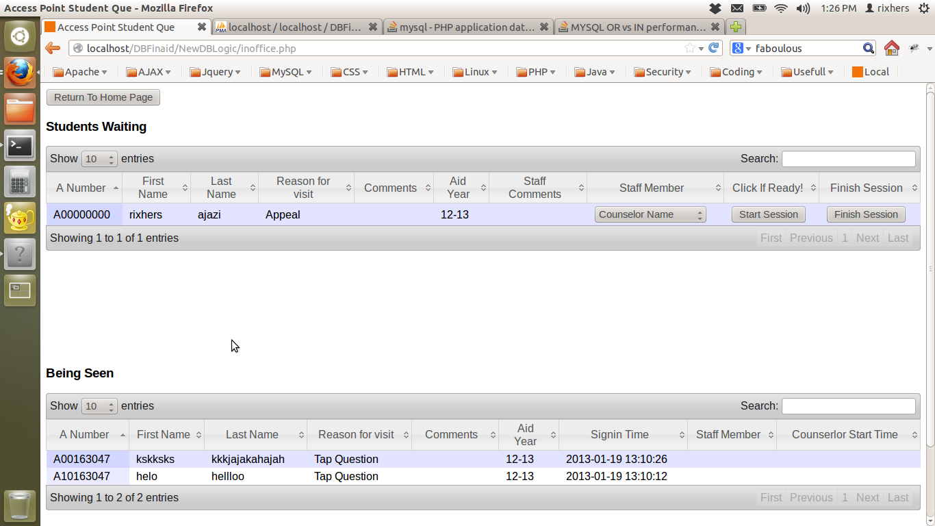 我的申请表上有一页是用来跟踪学生的。一旦辅导员接受了学生在现实生活中的一段时间。这样,学生的记录就会被放入一个名为支持的表格中。我的问题是,一旦由于任何原因而发生这种情况,如果顾问需要将会话分成两半,并将其放回que (如果另一位顾问接受了该会话),那么我就有相同数据的双、三、四倍(等等)被写入表。例子: