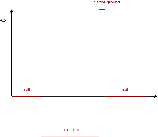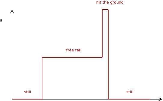 加速度在开始时为0,然后达到-9.81,此时你释放你的手机。然后它会撞上地面,在小加速度峰值中看到,然后加速度又是零。