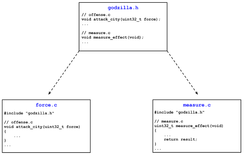 假设您正在创建一个库。经过仔细考虑,您已经决定,您想要构想的最终库,又名“哥斯拉”,应该由两个绑定到头文件的单独C文件组成。在这个头文件中将存在函数声明;例如: