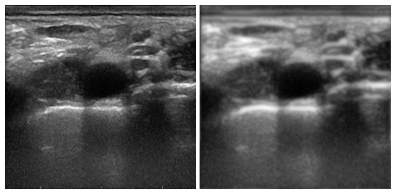 us_im_ad = anisodiff(ultrasound,100,80,0.075,(1,1),2.5,1)并列比较