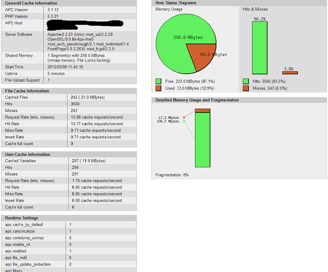 Server Software Apache/2.2.23 (Unix) mod_ssl/2.2.23 OpenSSL/0.9.8e-fips-rhel5 mod_auth_passthrough/2.1 mod_bwlimited/1.4 FrontPage/5.0.2.2635 mod_fcgid/2.3.6下面是我的APC设置。