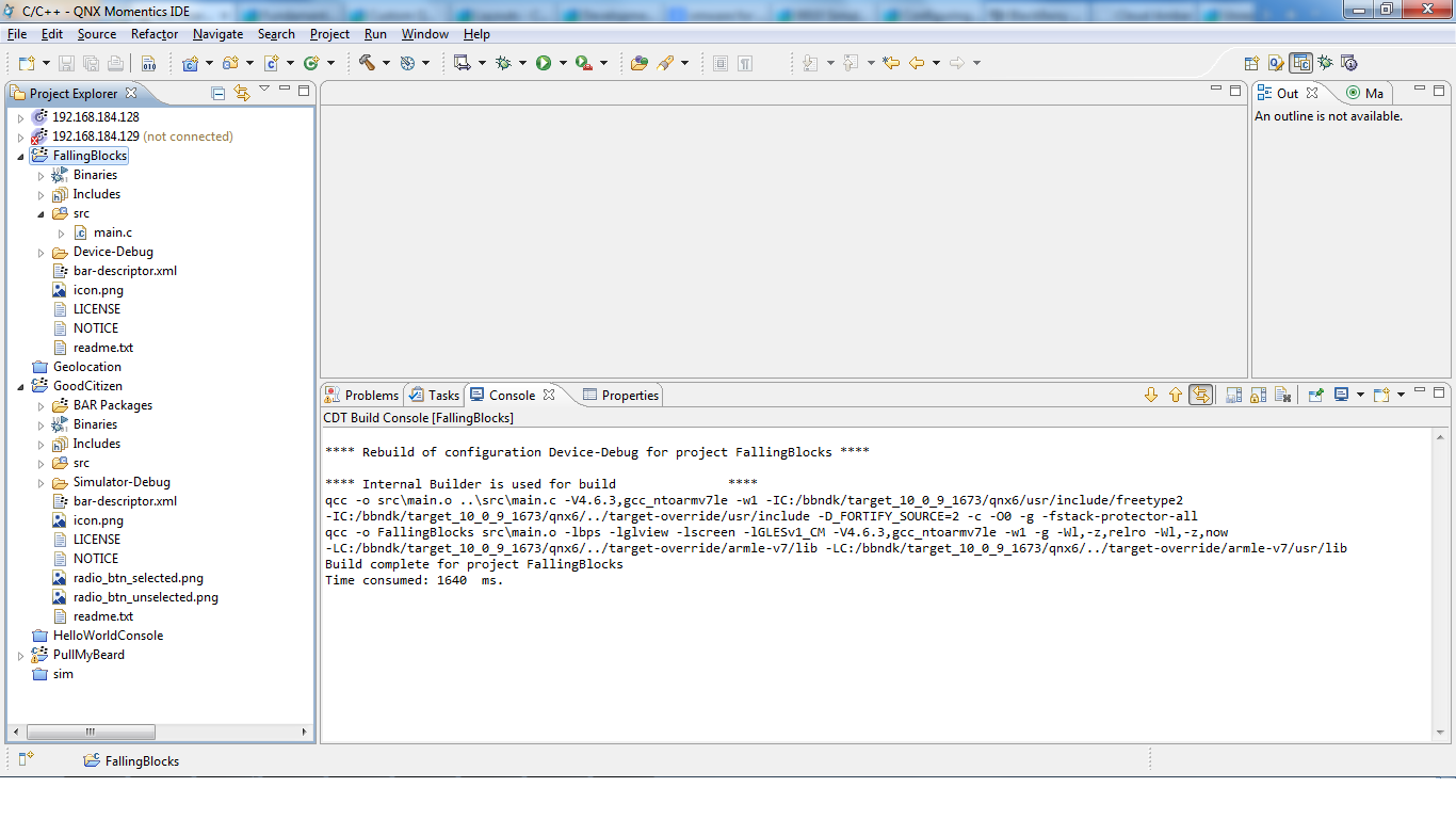 事实上,这不是一个答案,我没有任何选择的图像帖子,这就是为什么我这样做,这里我向您展示的快照,我的QNX,我已经从样本项目导入了GoodCitizen &下降块。良好的公民项目工作良好,编译和运行在虚拟机上。但是在落地而起的项目中,没有条形包创造了为什么会发生这种情况,谁能解释我的情况。