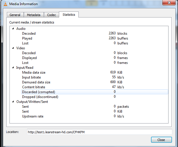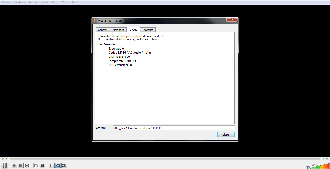 运行vlc中的URI并转到Tool --> Codec Information检查细节。下面是http://test1.leanstream-hd.com/CFHKFM URI的屏幕截图