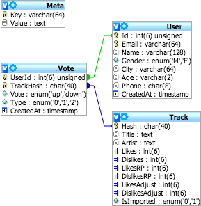 这是一个存储选票的数据库。用户选择他们喜欢的音轨,然后投票给他们。他们可以投“赞成”或“反对”。像馅饼一样简单。但是,当涉及到计算数据时,它会变得毛茸茸的。