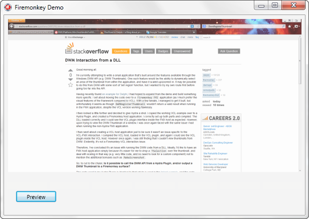 然后我再往前看,决定给九头蛇一次机会。我将工作的VCL示例复制到一个Hydra插件中,并创建了一个Fire猴子主机应用程序。我正确地设置了两个部分并进行了编译。DLL正确加载,我可以看到预期的FMX主机内的VCL插件接口。然而,在试图查看窗口的DWM缩略图时,我再次遇到了运行非水电FMX应用程序时遇到的相同问题。