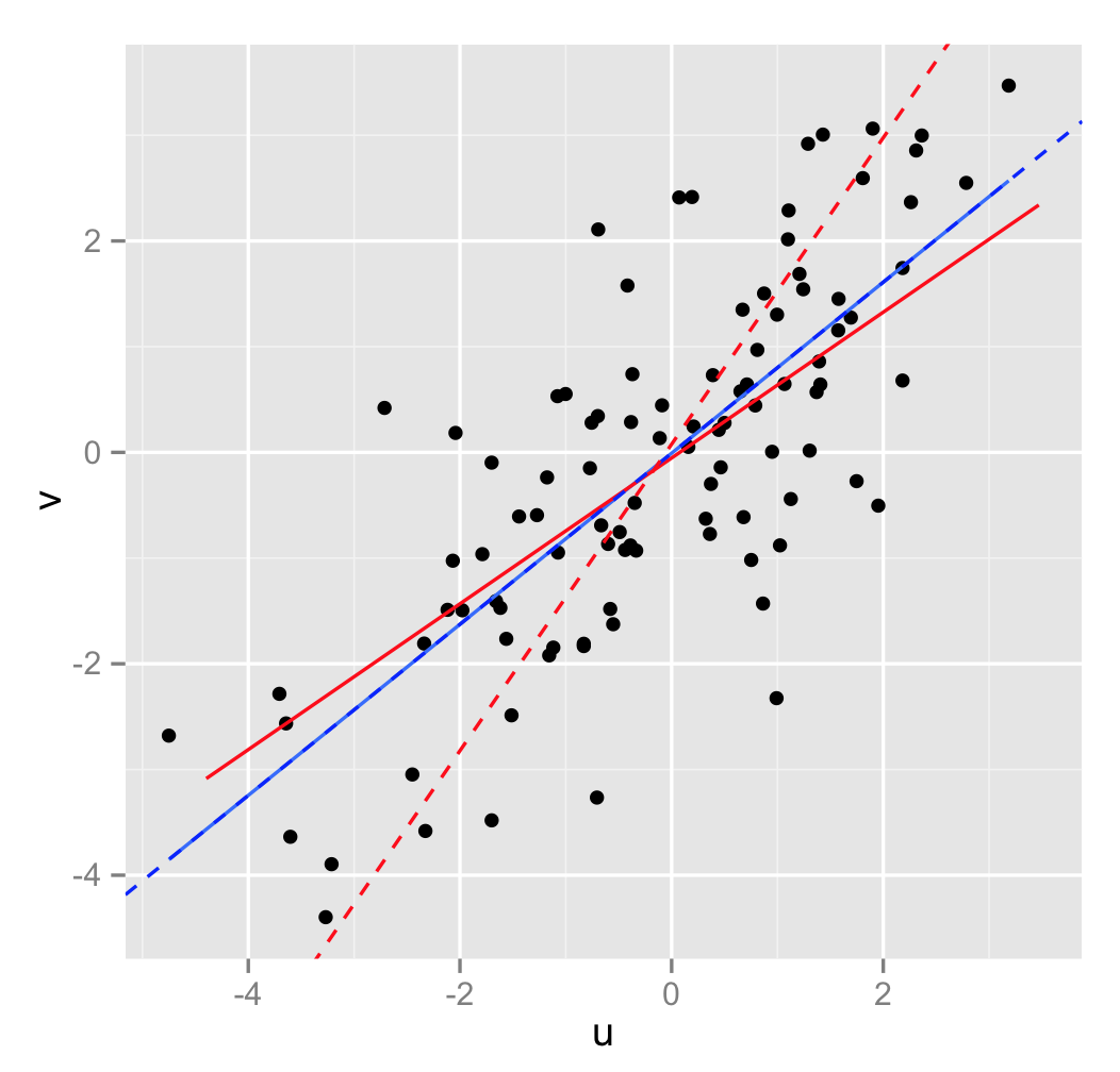 last_plot() + geom_smooth(aes(v, u), method="lm", color="red", se=FALSE)当然,这不太管用。第二个geom_smooth显示了正确直线的逆(我认为)。我希望它的坡度比第一条线还要陡。