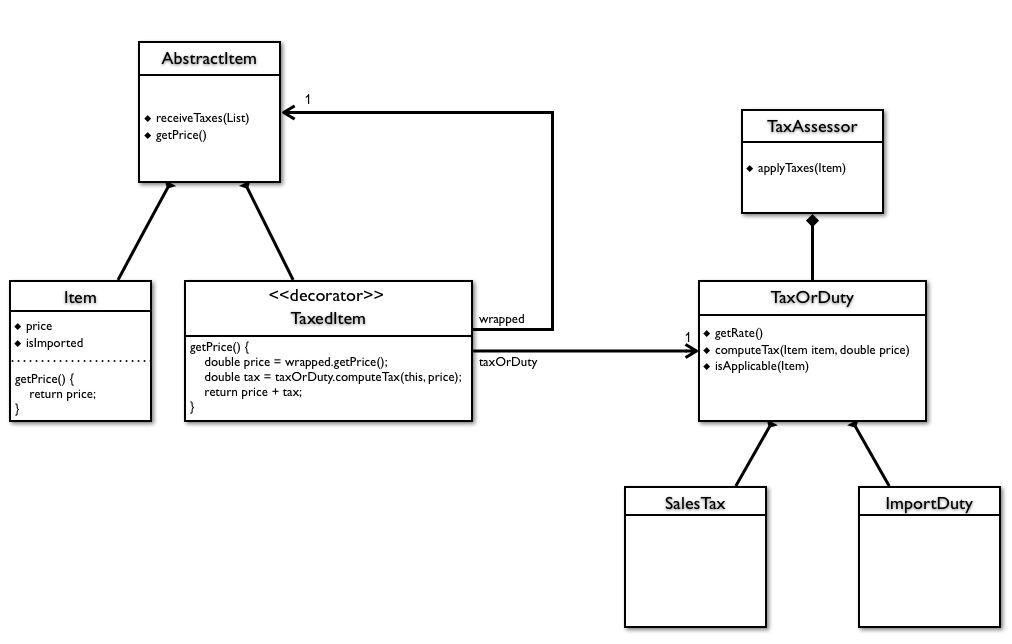 TaxAssessor是一个负责协调可适用的税收分配的类.它包含所有TaxOrDuty实例的列表(在本例中,只有一个SalesTax实例和一个ImportDuty实例)。它的方法applyTaxes(Item)迭代这个集合,调用isApplicable()。对于任何返回true的TaxOrDuty,TaxAssessor都会将该项包装在TaxedItem的一个新实例中(当然,该实例引用了TaxOrDuty):