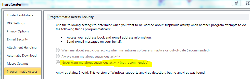 它看起来是灰色的,因为我没有作为管理员运行outlook。如果您以管理员身份运行outlook,您将能够更新安全设置。