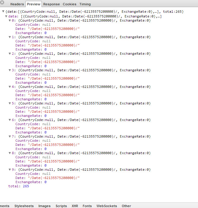 我遗漏了什么,注意来自SelectImportedCurrencyRates的响应如何返回日期的'1/1/1‘,国家代码是'null’,汇率是'0‘。当我调试并检查绑定对象ICollection<CurrencyExchangeRate> currencyRatesImported时,它的绑定值为'0‘、'1/1/1’和null