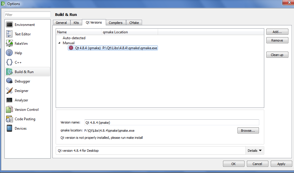 Windows 7:我安装了QT4.8.4Win和QtCreator2.6.2Win,VS2010 (从这里开始)。当我试图打开一个项目(以前用Qt 4.8.3 /Creator2.5.2编译)时,它说我需要一个工具包(no valid kit),最终我会在Qt version is not properly installed上结束。所有的都显示在下面的截图中。