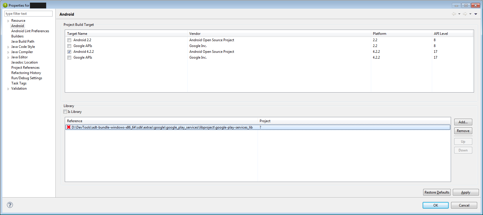 唯一的问题是,它总是在初始的绿色标记之后,当重新打开"Project -> Properties -> -> Library“...and时,它变成了一个红十字会,而...and也没有将"google-play-services_lib.jar”添加到项目中的"Android依赖项“。