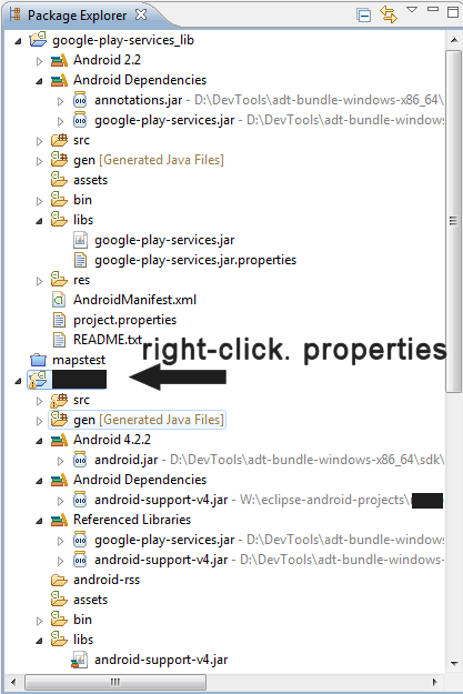然而,人们告诉我,要使地图正常工作,我还需要在我的"Android依赖项“文件夹中使用,方法是通过这样做:”将Google服务放入您的项目Project -> Properties -> Android -> Library,添加-> google- Play - Services _lib“