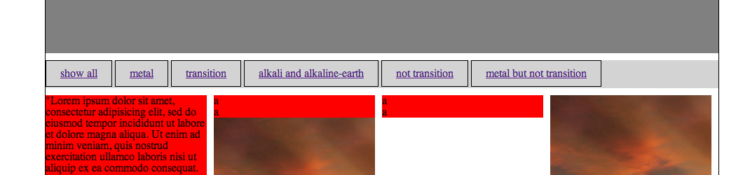<div class="item">a</div>到目前为止,我设法使它工作的唯一方法是将宽度设置为240px,但是在这些项之间没有间隔。