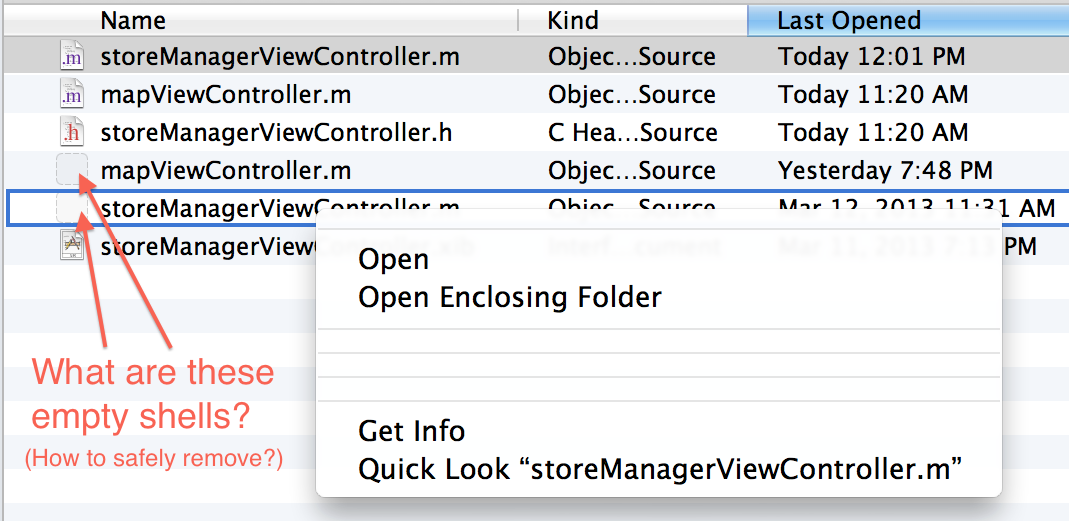 在我的Xcode文件系统中,这些空shell是什么?安全地删除它们的过程是什么?还在Xcode中搜索了重复的引用,但没有找到。