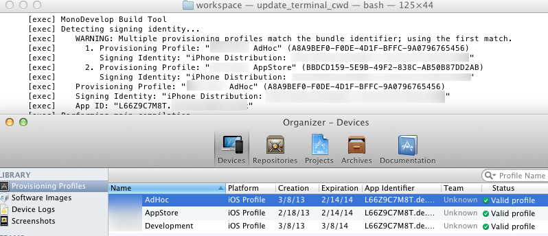 '/Applications/Xamarin Studio.app/Contents/MacOS/mdtool' -v build '--configuration:AppStore|iPhone' MyAppProject.csproj现在,在xCode中,我已经设置了几个配置配置文件,mdtool似乎混淆了使用哪一个配置文件: