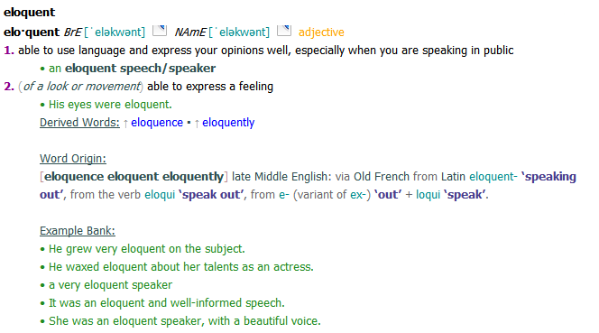 <dd> <font color=rosybrown>[</font><font color=darkslategray><b>eloquence</b></font> <font color=darkslategray><b>eloquent</b></font> <font color=darkslategray><b>eloquently</b></font><font color=rosybrown>]</font> <font color=darkgray> </font><font color=darkslategray><!--lang-->late Middle English<!--/lang--></font><font color=dimgray><!--etymology-->: via <!--/etymology--> </font><font color=darkslategray><!--lang-->Old French<!--/lang--> </font><font color=dimgray><!--etymology--> from <!--/etymology--> </font><font color=darkslategray><!--lang-->Latin<!--/lang--> </font><font color=darkgray> </font><font color=darkcyan><!--ff-->eloquent-<!--/ff--> </font><font color=darkgray> </font><font color=darkslateblue><b><!--etym_tr-->‘speaking out’<!--/etym_tr--></b></font><font color=dimgray><!--etymology-->, from the verb <!--/etymology--> </font><font color=darkcyan><!--ff-->eloqui<!--/ff--> </font><font color=darkgray> </font><font color=darkslateblue><b><!--etym_tr-->‘speak out’<!--/etym_tr--></b></font><font color=dimgray><!--etymology-->, from <!--/etymology--> </font><font color=darkcyan><!--ff-->e-<!--/ff--> </font><font color=dimgray><!--etymology--> (variant of <!--/etymology--> </font><font color=darkcyan><!--ff-->ex-<!--/ff--></font><font color=dimgray><!--etymology-->) <!--/etymology--> </font><font color=darkslateblue><b><!--etym_tr-->‘out’<!--/etym_tr--> </b></font><font color=dimgray><!--etymology--> + <!--/etymology--> </font><font color=darkcyan><!--ff-->loqui<!--/ff--> </font><font color=darkgray> </font><font color=darkslateblue><b><!--etym_tr-->‘speak’<!--/etym_tr--></b></font><font color=dimgray><!--etymology-->.<!--/etymology--> </font> <dd> <br>