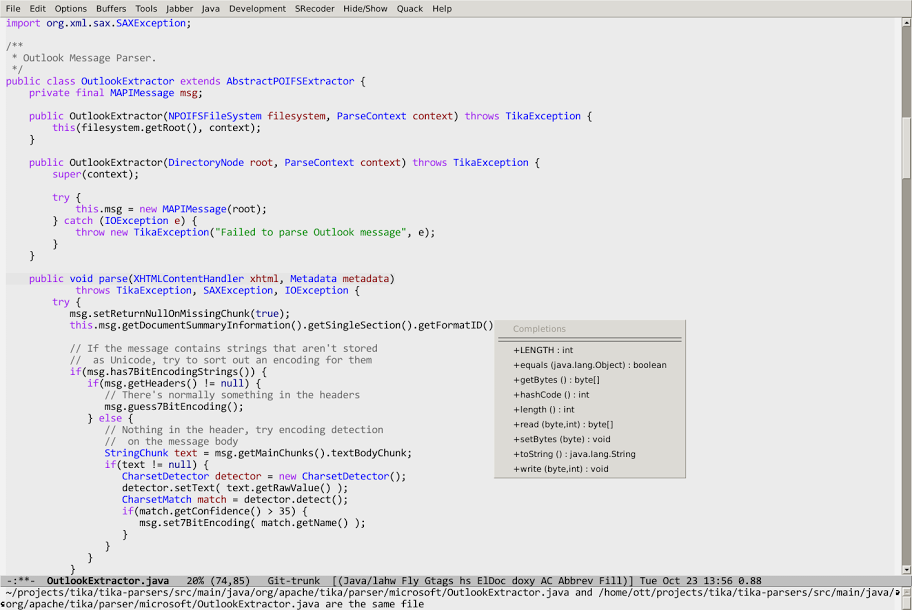我试图在OS上为emacs 24配置京东。当我创建一个.java文件时,环境似乎是自动加载的(请看图),因此它似乎安装正确。然而,当我试图使用M-x jde-complete自动完成任何事情时(我还没有将它绑定到任何键),我得到了以下消息: