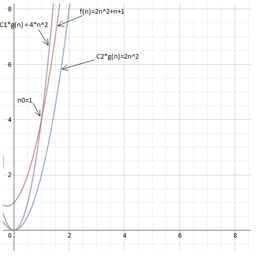 if f(n)= 2n^2+n+1 then, c1*g(n) and c2*g(n) are presented by diagram: