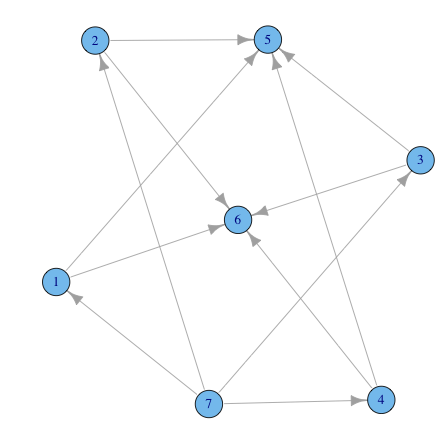 > adjm<-t(matrix(c(0,0,0,0,1,1,0, 0,0,0,0,1,1,0, 0,0,0,0,1,1,0, 0,0,0,0,1,1,0, 0,0,0,0,0,0,0, 0,0,0,0,0,0,0, 1,1,1,1,0,0,0),nrow=7,ncol=7)); g1<-graph.adjacency(adjm); plot(g1)https://stackoverflow.com/questions/15695859