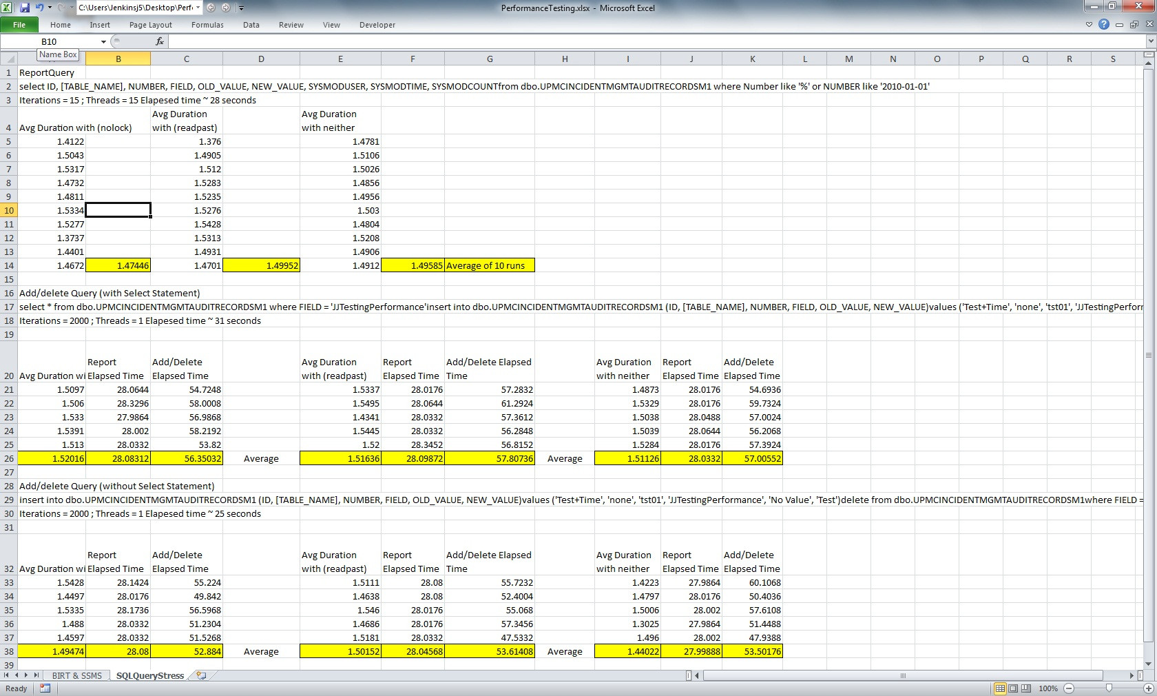 运行三个版本的“ReportQuery”中的每一个版本的10次测试运行,这是为了确定‘with(Nolock)’、‘with(Readpast)’和没有提示之间是否有任何性能上的好处。结果表明,ReportQuery在28秒内持续运行,平均迭代时间为1.5秒,差异无显着性。