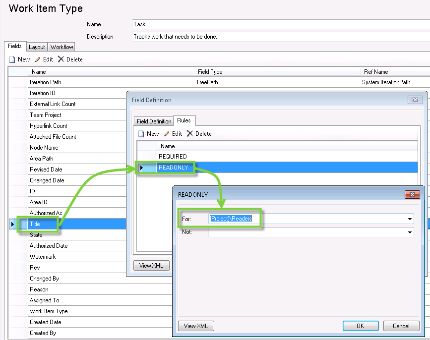 不能根据查看工作项的人员使字段可见;但是,可以使字段仅依赖于组。要做到这一点,请参见下面的屏幕快照: