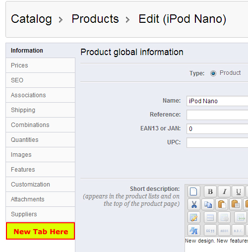 我想添加一个新的标签在产品管理页,如特性标签,属性标签等在PS版本1.5.x与一个自定义模块。我正在添加此选项卡到产品编辑页面,以便我可以添加选项,以上传产品视频到管理员。