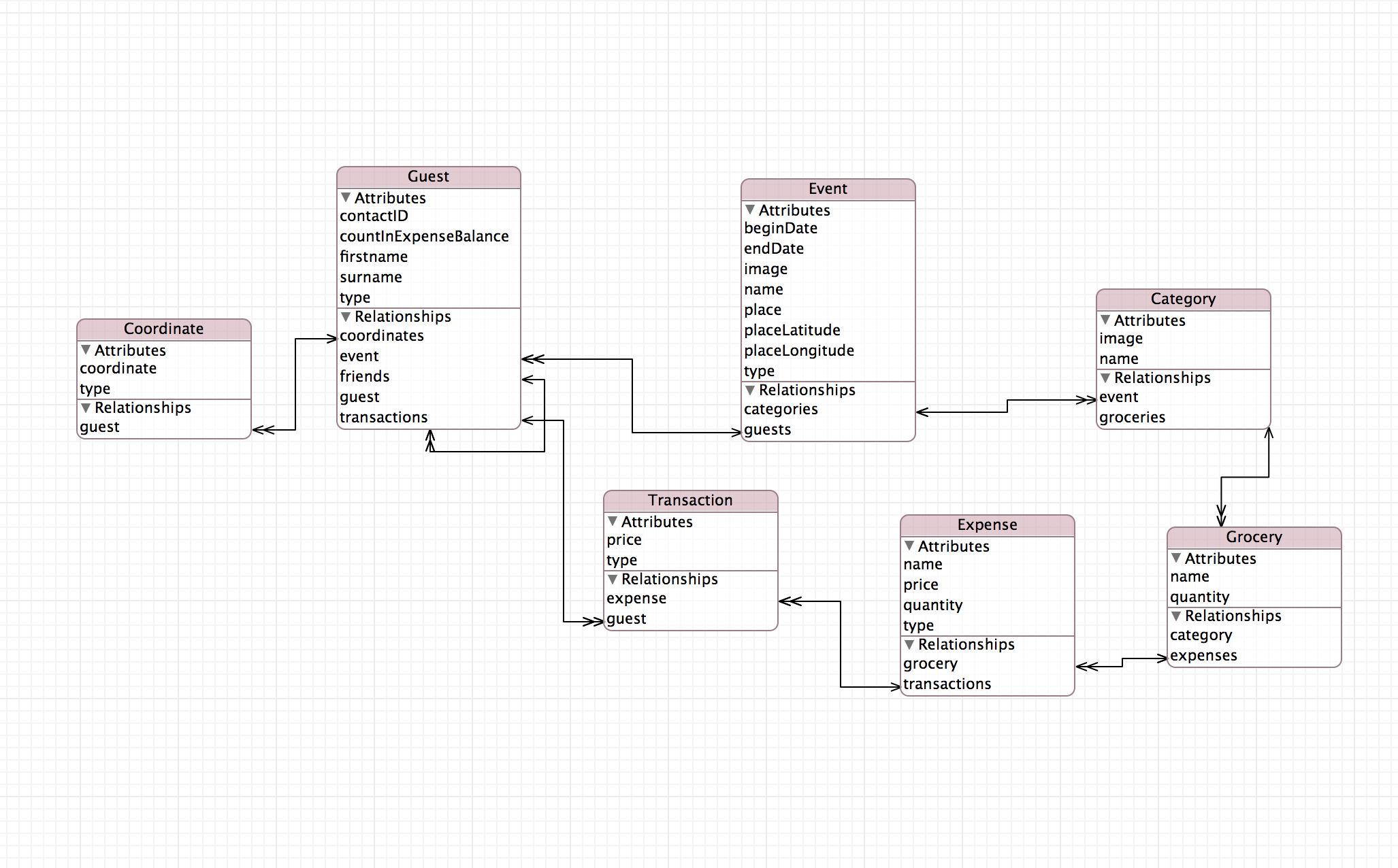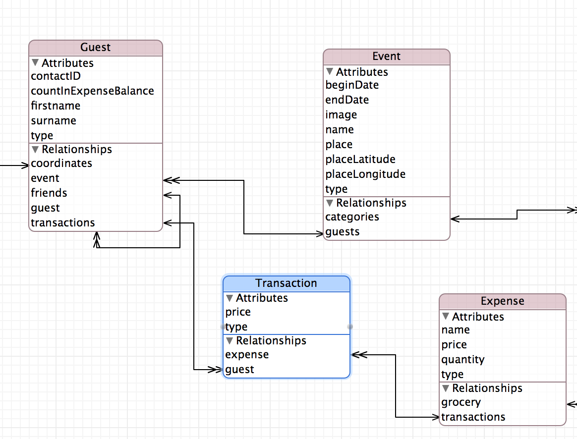 下面是我如何处理这些实体:对于one事件中的one开销,一个来宾为所有其他客户支付此费用,因此我创建一个与这个来宾相关的事务,并使用‘pays’类型创建开销,而具有许多事务,如e 224与E 125>关联的事件来宾,与E 226费用相关联,但与类型"Beneficied“相关联。