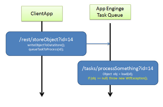我已经实现了两个服务器端HTTP端点,其中1)存储一些数据,2)处理它。方法1)通过App引擎任务调用方法2),因为它们是我不希望客户端等待的耗时任务。这个过程在下面的顺序图中得到了说明。