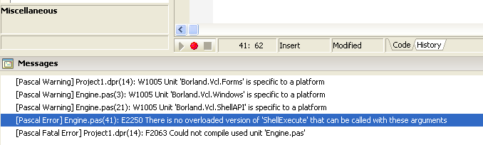 Pascal Engine.pas(41):E2250没有使用这些参数调用的“ShellExecute”重载版本