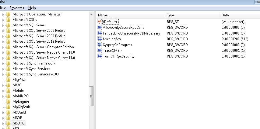 The MS DTC Connection Manager is unable to register with RPC to use one of LRPC, TCP/IP, or UDP/IP. Please ensure that RPC is configured properly. If "ServerTcpPort" registry key is configured(DWORD value under the HKEY_LOCAL_MACHINE\Software\Microsoft\MSDTC for local DTC instance or under cluster hive for clustered DTC instance), please verify if the configured port is valid and the port is not already in use by a different component. Error Specifics:hr = 0x80070057, d:\w7rtm\com\complus\dtc\dtc\cm\src\iomgrsrv.cpp:2523, CmdLine: C:\Windows\System32\msdtc.exe, Pid: 5332